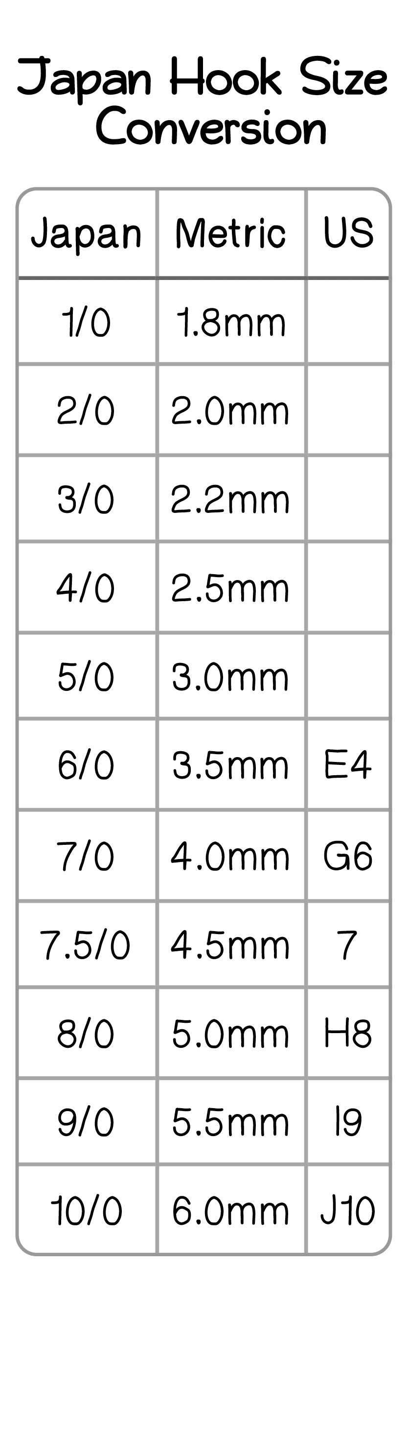 As this crochet hook is made in Japan, the sizes engraved on the hook will be in Japan sizes for e.g. 5/0. You will be provided with a hook size conversion table in your order for easy reference.